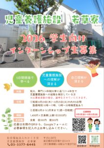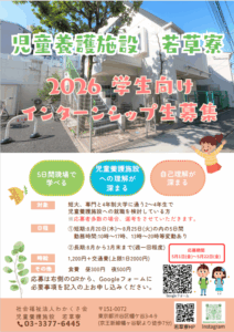 学生向けインターンシップ募集のお知らせ今年度も、若草寮ではインターンシップ募集を行ないます。インターンシップ募集要項対象短大、専門と4年制大学に通う2~4年生で児童養護施設への就職を検討している方※枠…