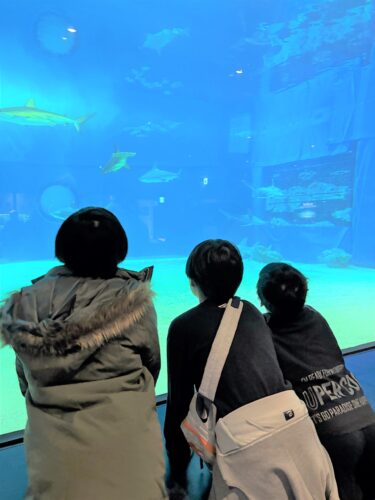 「サメは何度も歯を使い捨てて新しい歯に生まれ変わる」などの説明を聞いていました。大きな水槽を見つめ、熱心に観察中です。