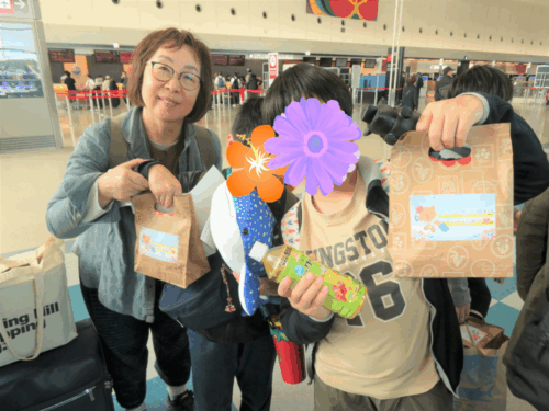 沖縄に着き、「めんそ~れ!」と出迎えられ、歓迎の「お菓子のレイ」をかけてもらいました。