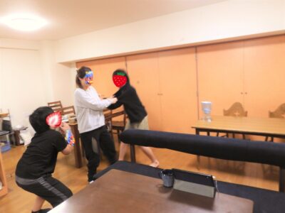 さらにこちらのグループでは鬼を退治するぞ!と張り切り、まずは鬼のお面を的にして豆を投げる練習を開始 (笑)