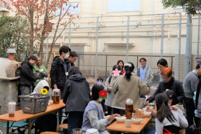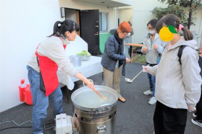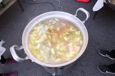 飾りつけと並行して昼食作り。今回は、大きなお鍋で「うどんすき」を作りました。