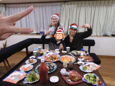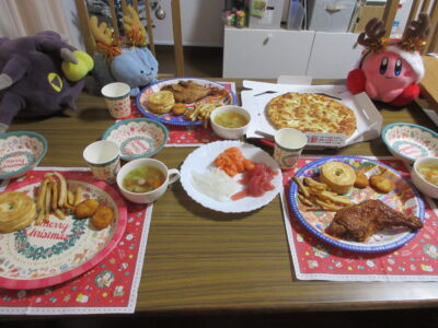 続いてこちらの女の子グループでは手巻き寿司やピザの他に、久しぶりに近所のお肉屋さんで購入したチキンを食べました。お肉屋さんのチキンがとっても柔らかくて美味しかったです。