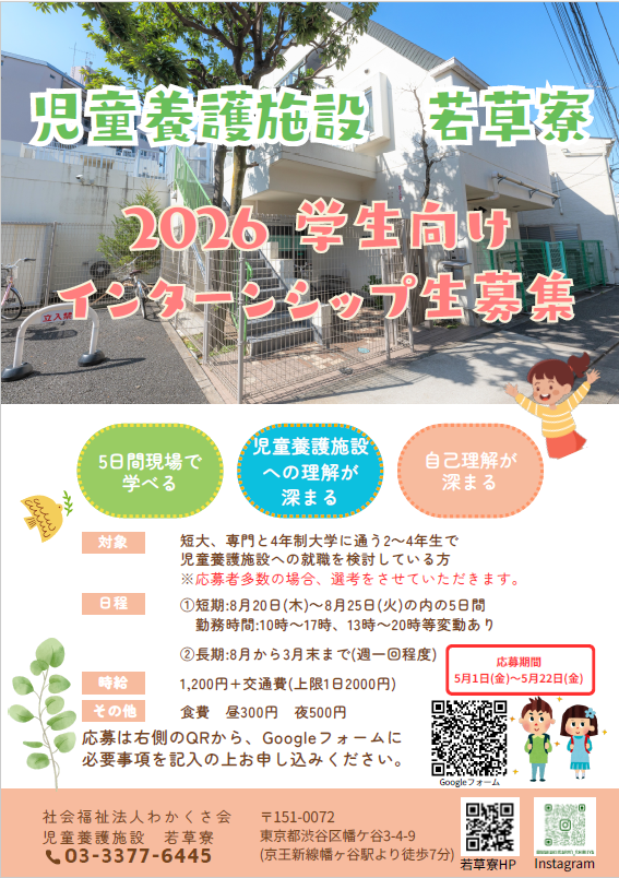 今年度も、若草寮ではインターンシップ募集を行ないます。